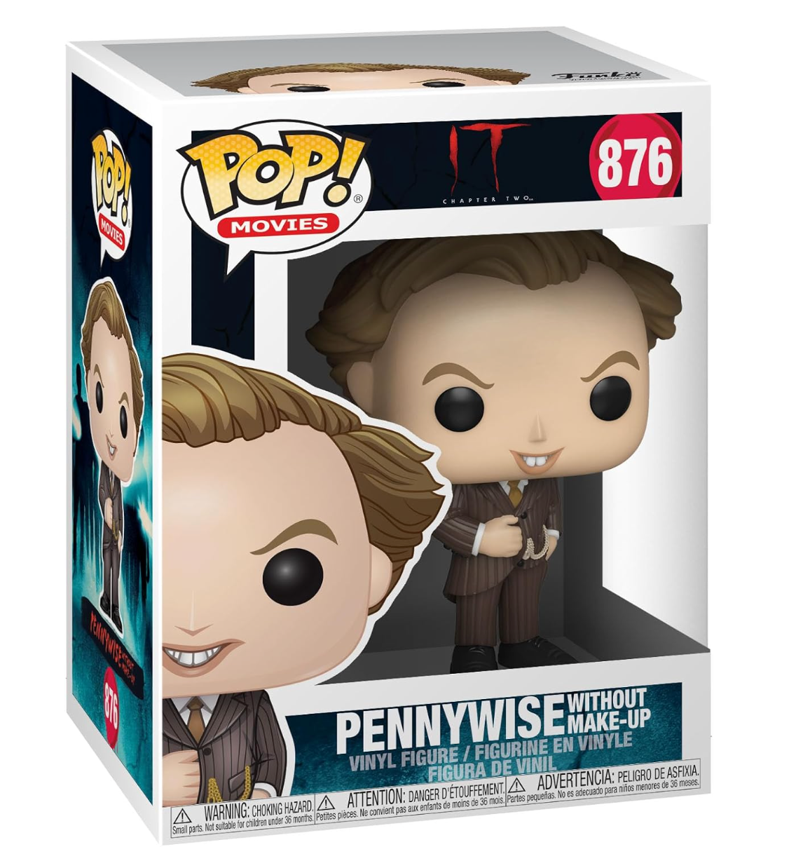 El Funko Pop! Pennywise Without Makeup #876 muestra una versión más inquietante y realista del icónico personaje de IT, sin el maquillaje de payaso que lo caracteriza. Esta figura resalta el lado oscuro del personaje, convirtiéndola en una pieza imperdible para fans del terror y coleccionistas de ediciones especiales.
